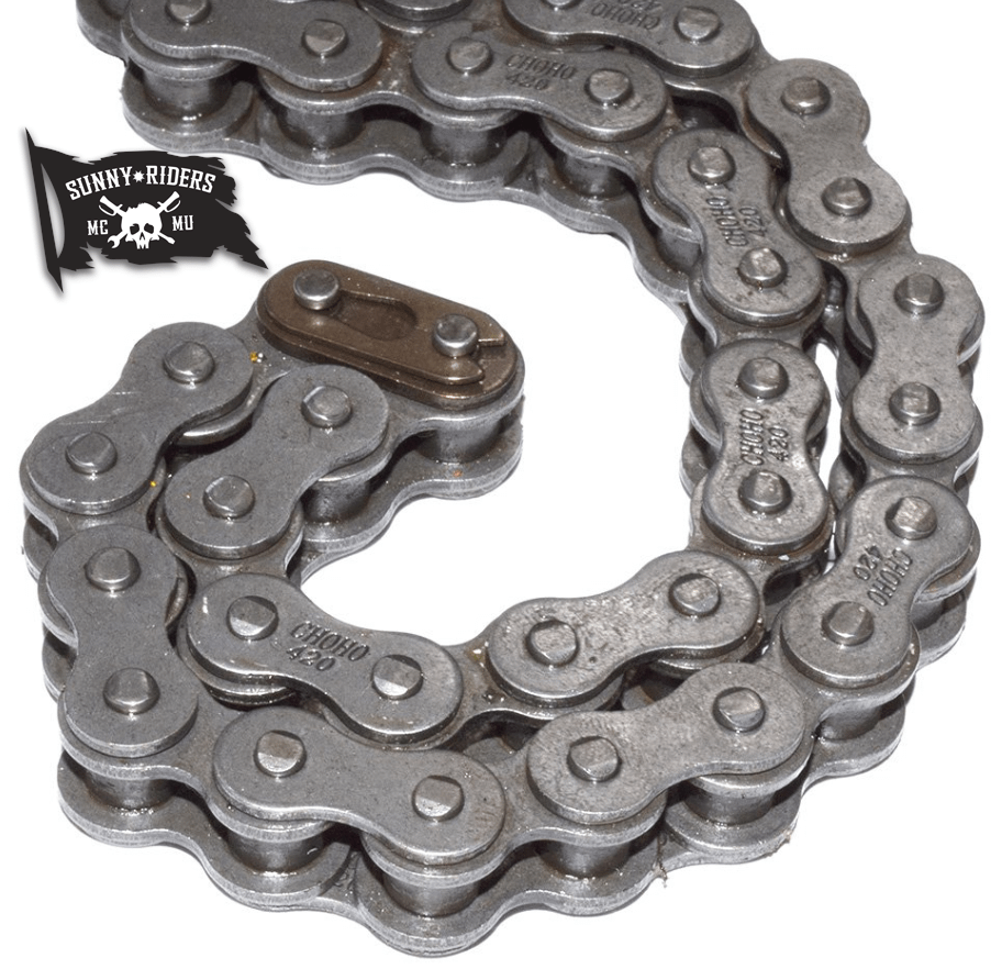 Le pas de la chaine est déterminé par la distance entre 2 axes de maillon, le diamètre des rouleaux et l’épaisseur de la couronne. Il faut donc que le pignon + la couronne soit de la même épaisseur et que la chaine corresponde aux dents et pas de la chaine. Pour faire simple le pas de la chaine est souvent noté sur un des maillons. Il faut donc que la chaine + le pignon et la couronne soient compatibles en longueur et pas.