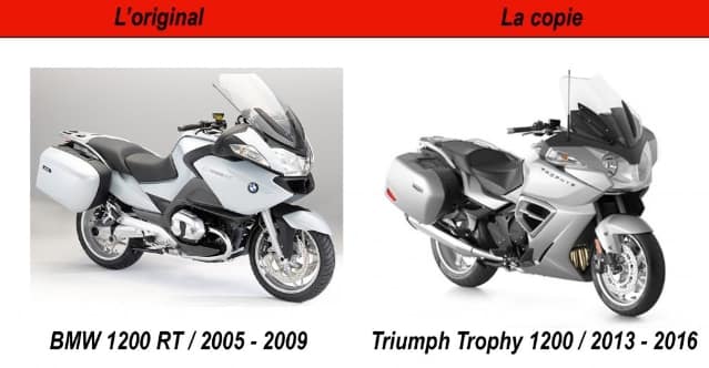 Au sujet de la BMW 1200 rt et de la Triumph 1200 Trophy, on ne peut pas parler de copie tant les 2 motos sont diamétralement opposées.
