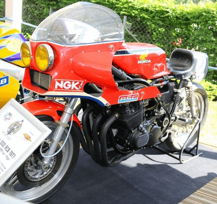 Honda 1000 RCB pilotée par Jacques Luc et Hubert Rigal lors du Bol d’Or 1978. Caractéristiques: 4 cylindres en ligne 4 temps 1000 cm3 125 cv 165 kg 280 km/h.