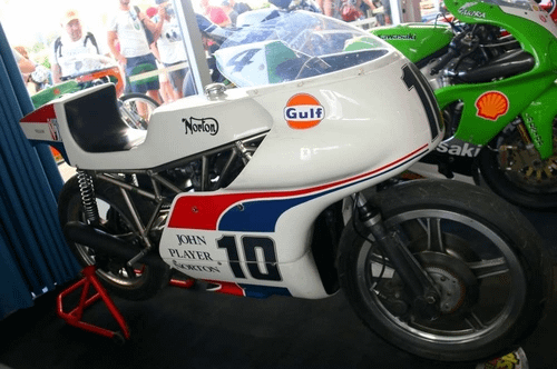 Norton John Player Formula 750 1974. Moteur Norton Commando kitté. Caractéristiques: bicylindre 4 temps 72 cv 155 kg 240 km/h.