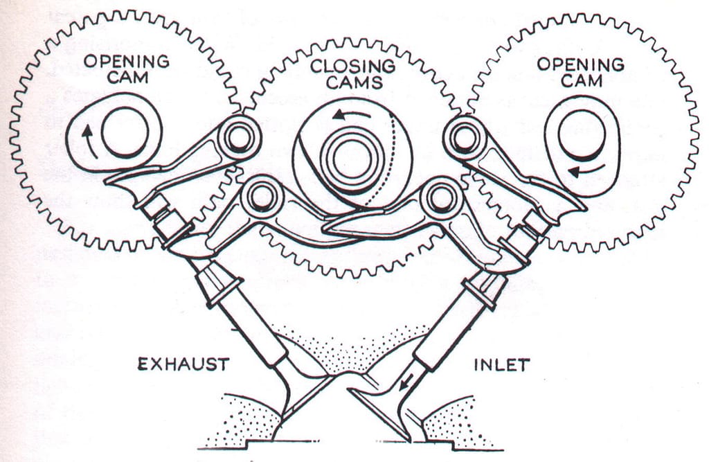 - Un second arbre à cames assure la fermeture des soupapes de manière mécanique, remplaçant le rôle habituellement dévolu aux ressorts.